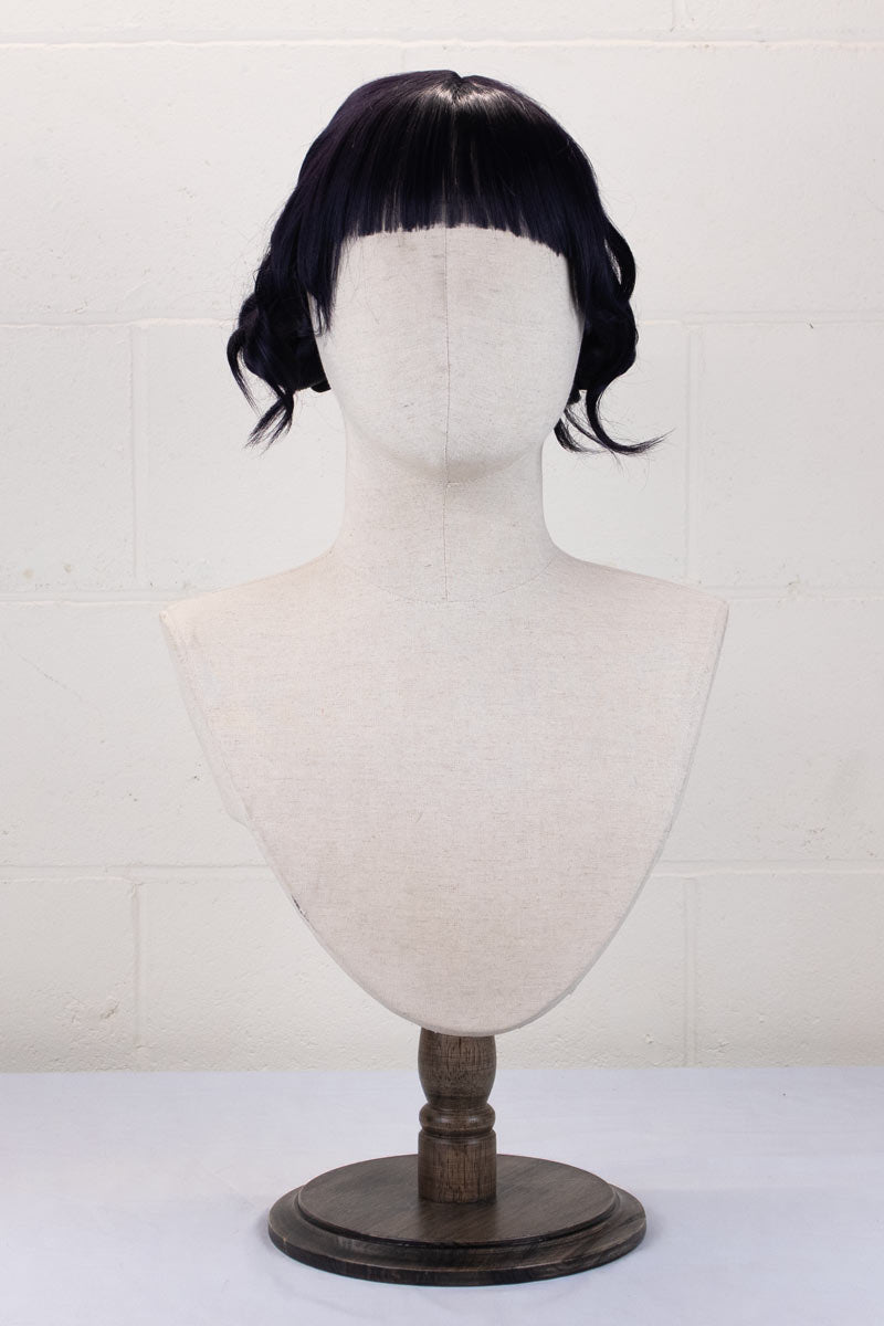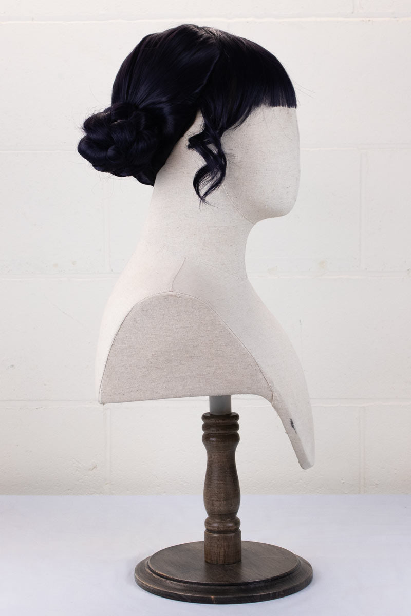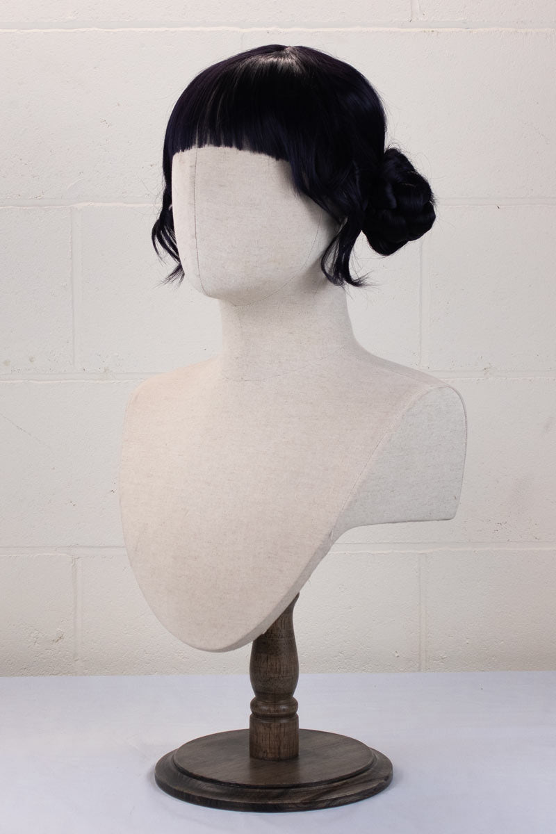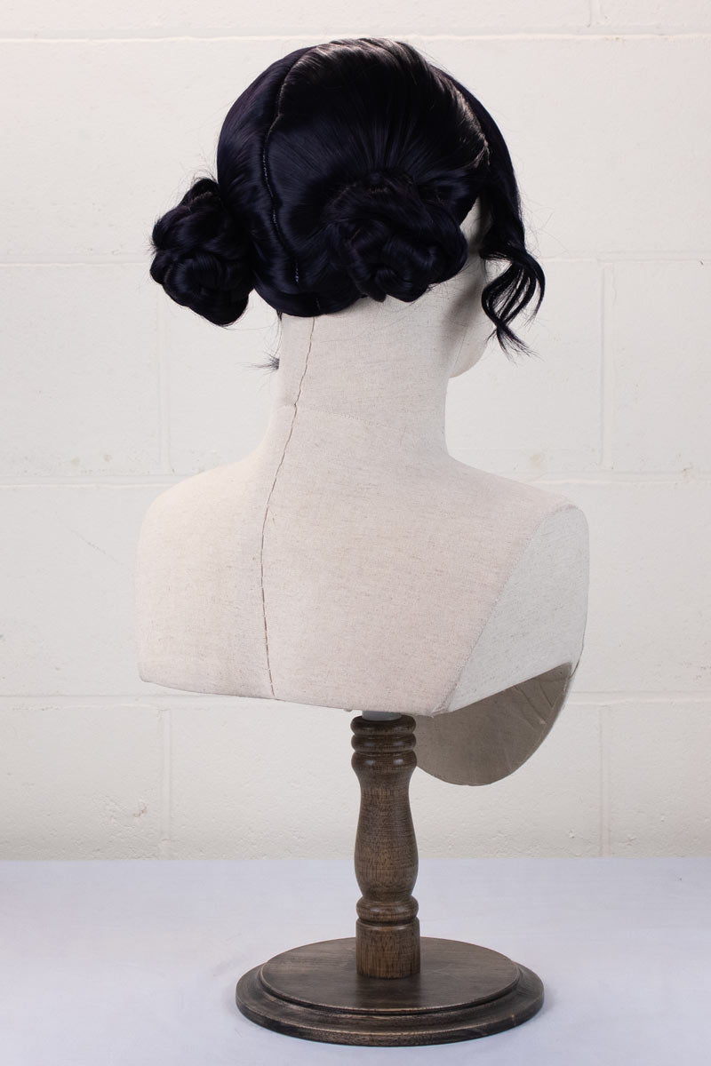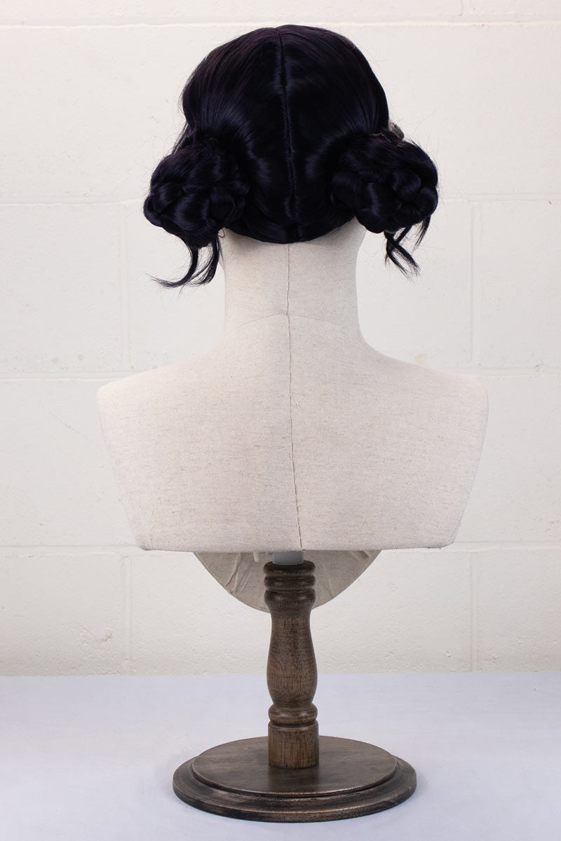 Our Zoey wig uses a mix of our standard colours Darkest Blue and Darkest Purple, to help recreate her deep blurple shade. The wig is parted from the top down to the back, and the braided buns are incorporated into the wig.